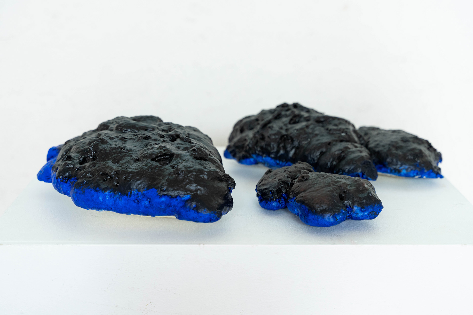 A material experimentation of scorched black earth. The charred terrain lies barren after the devastation of a fictional fire, each island held together with the suggestion of a river in between them. The soil that was once fertile can no longer host life, a landscape stripped of vitality, the blackened texture contrasting against the vibrant blue of the river. A reminder that nature endures beyond human destruction.
